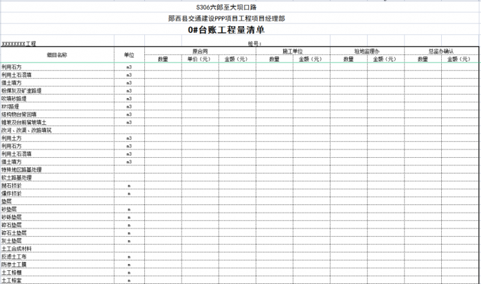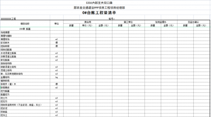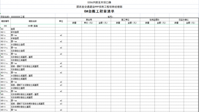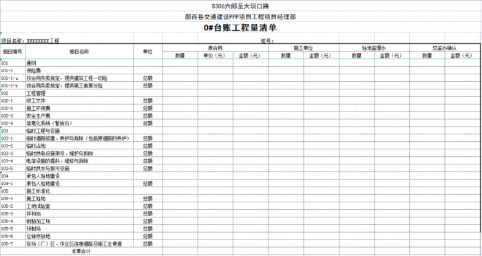 一個(gè)項(xiàng)目或一個(gè)合同段的臺(tái)賬由n條可以獨(dú)立計(jì)量的工程結(jié)構(gòu)(單元)組成,一般情況下一條臺(tái)賬應(yīng)包含子目號(hào)、子目名稱、單位、工程數(shù)量、單價(jià)、合價(jià)、里程樁號(hào)、工程部位描述、圖紙編號(hào)、備注說(shuō)明等。